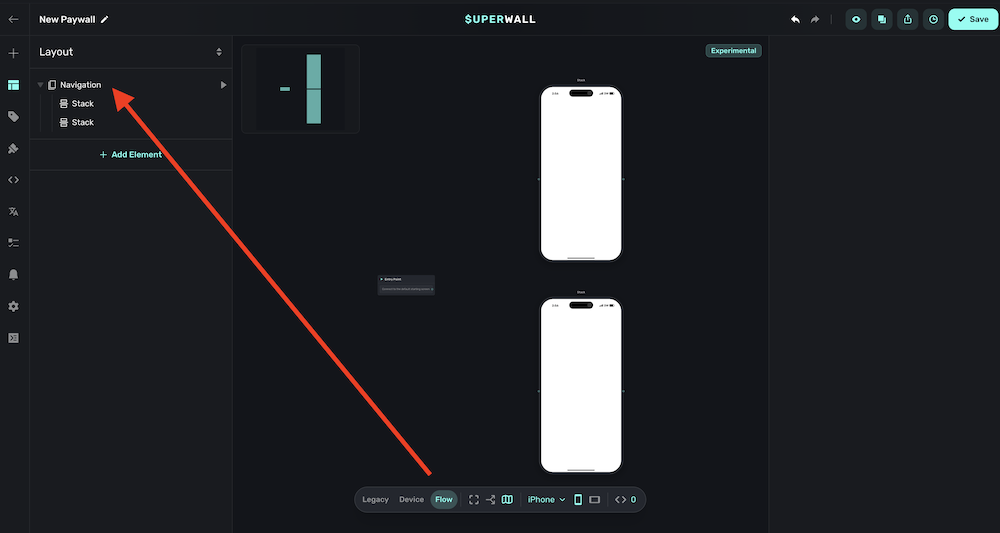 Once you add a navigation component, a new option called "Flow" becomes available in the floating toolbar: